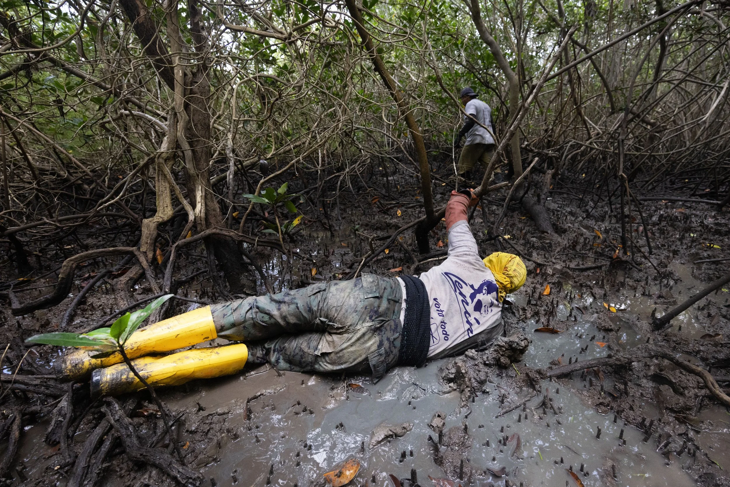 The crabbers, or cangrejeros, climb through the dense tangle of roots to locate small openings in the ground where red mangrove crabs rest in deep, muddy burrows.